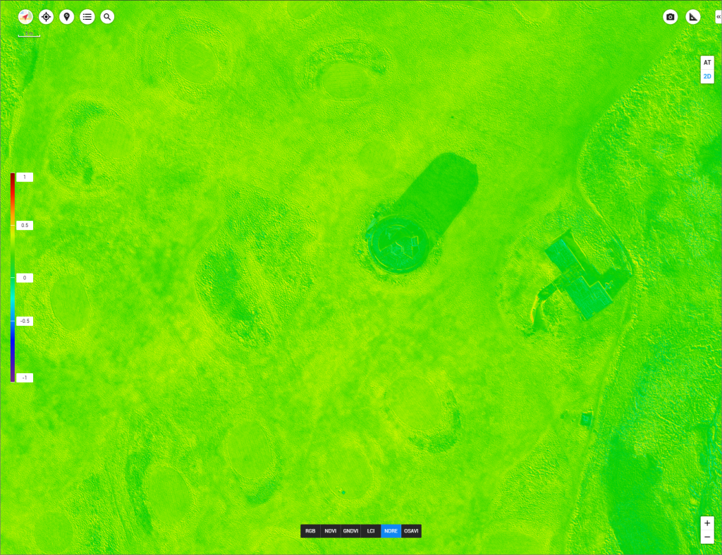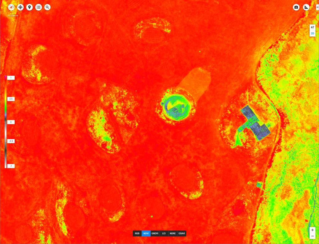 - Normalised Differential Vegetation Index [NVDI] – Uses the NIR and Red sensors to visualise the health of vegetation by measuring the difference between the Near-infrared light reflected by the vegetation and the red light absorbed by the vegetation.