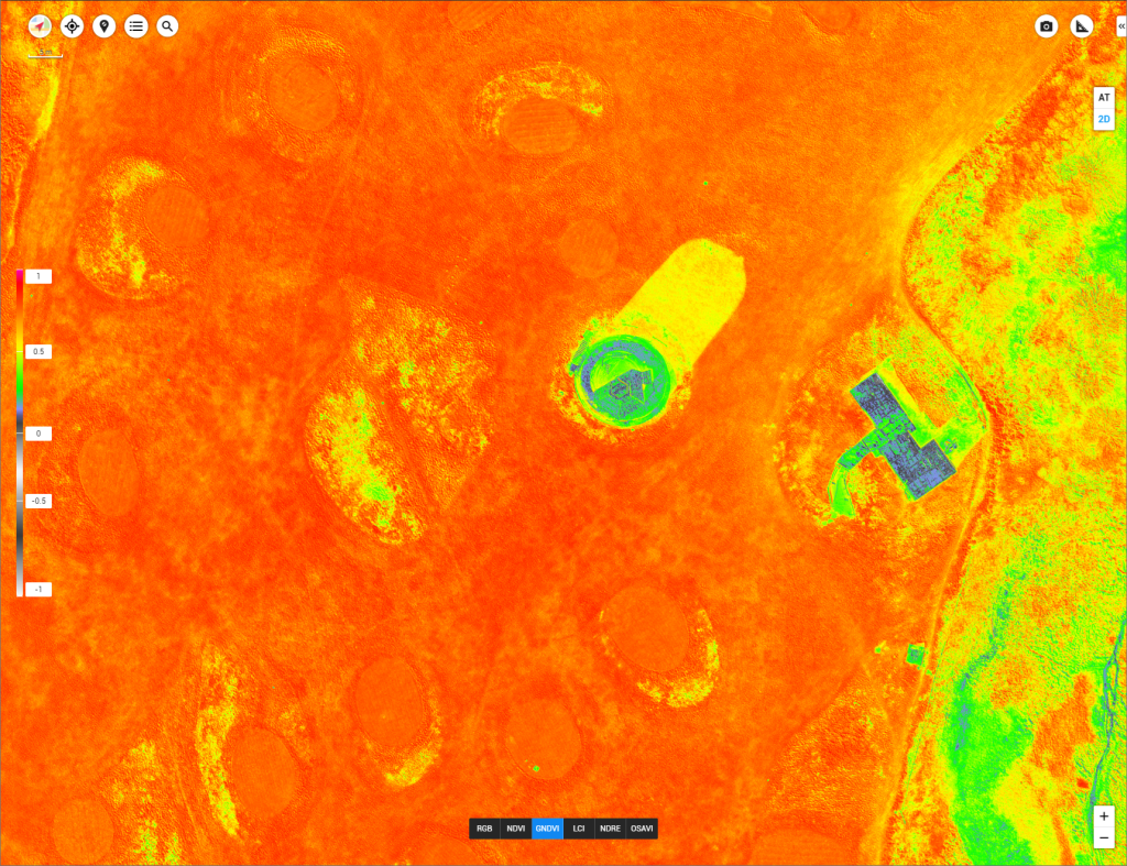 - Green Normalised Differential Index [GNVDI] – Uses the NIR and Green sensors to visualise photosynthetic activity or “greenness” of the vegetation. It is a measure to determine the amount of water and nitrogen uptake in the leaves.