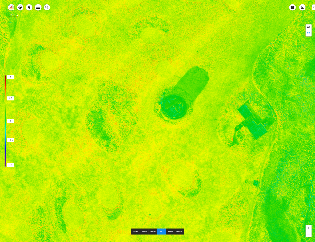 - Leaf Chlorophyll Index [LCI] (sometimes Green Chlorophyll Index [GCI]) – Uses the NIR and Red Edge sensors to provide a visual model of the amount of chlorophyll in the leaves of plants. The Red Edge sensor is very sensitive to light reflected back from the vegetation.