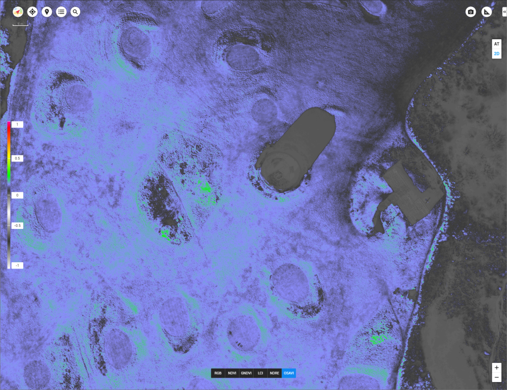 - Optimised Soil Adjusted Vegetation Index [OSAVI] – As with the NVDI this layer uses the NIR and Red sensors but applies an adjustment factor to account for any tree canopy cover and is useful when surveying areas with more than 50% canopy cover such as orchards or managed forests.